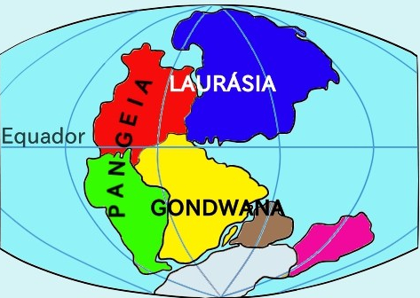 Figura 1 – Massas continentais reunidas em um único Supercontinente denominado PANGEA (Gondwana, ao sul e Laurásia, ao norte) no período Permiano (298 a 252 Ma).