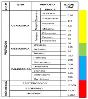[2] Tempo Geológico – Subdivisão da escala geológica em unidades geocronológicas que, da hierarquia mais alta para mais baixa, compreende as seguintes unidades: Eon, Era, Período, Época, Idade e Crono. Exemplos: era Cenozoica, Período Terciário, Época Mioceno, etc. A subdivisão do tempo geológico é feita principalmente com base em mudanças do conteúdo fossilífero (SUGUIO, 1998)