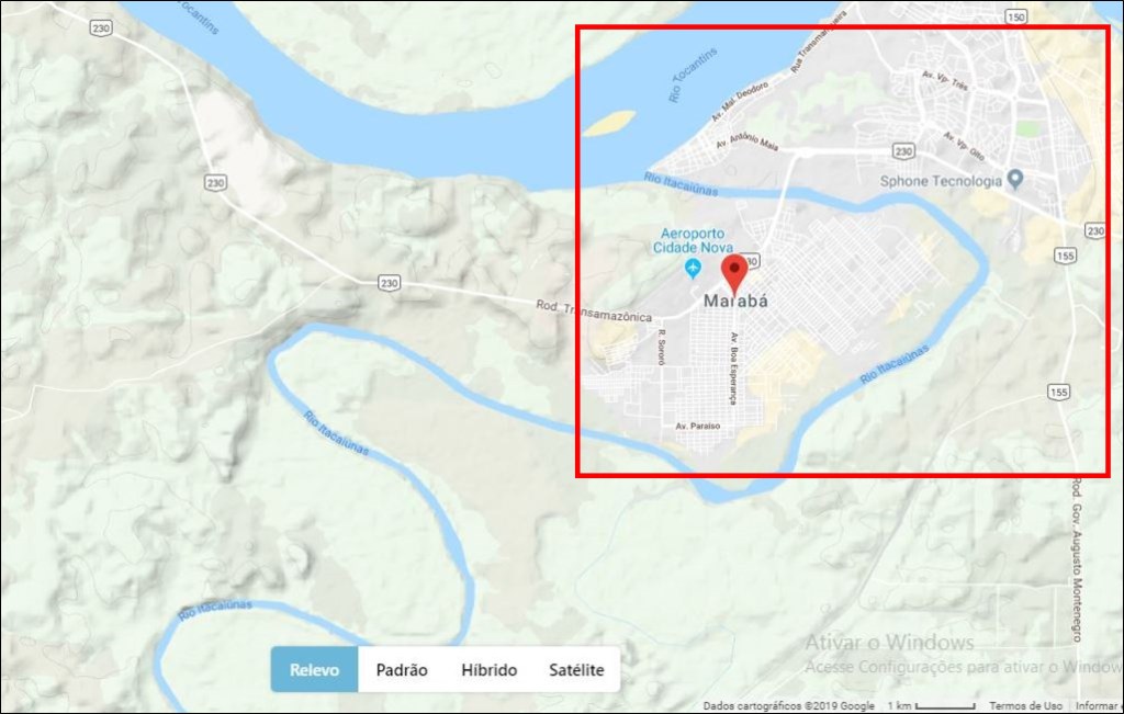 A bacia hidrográfica do rio Itacaiúnas, com 390 Km de extensão, tem sua nascente na Serra da Seringa, no município de Água Azul do Norte, estado do Pará (em direção ao canto inferior esquerdo na Figura 6), e é formado pela junção dos rios Água Preta e Azul. Seus principais afluentes são os rios Madeira e Sororó. Desemboca pela margem esquerda do rio Tocantins, no perímetro urbano da cidade de Marabá (DICIONÁRIO, 2016). Nesta figura é ilustrada a posição do núcleo urbano da cidade de Marabá (Velha Marabá ou Marabá Pioneira, instalada justo na planície de inundação do rio Itacaiúnas, com o Tocantins) e a e Nova Marabá, margem esquerda do rio Itacaiúnas.