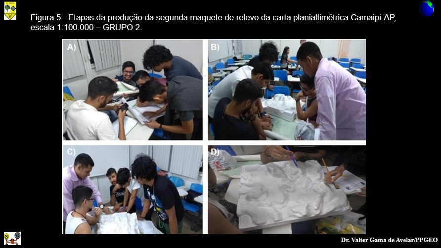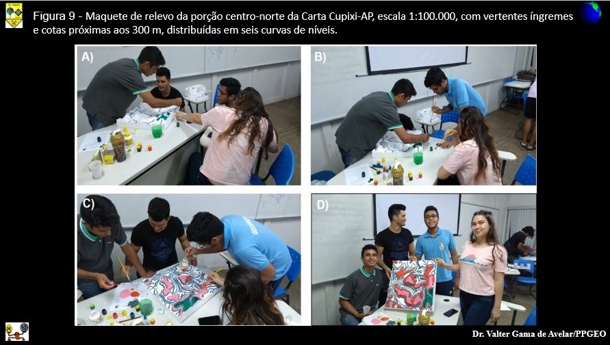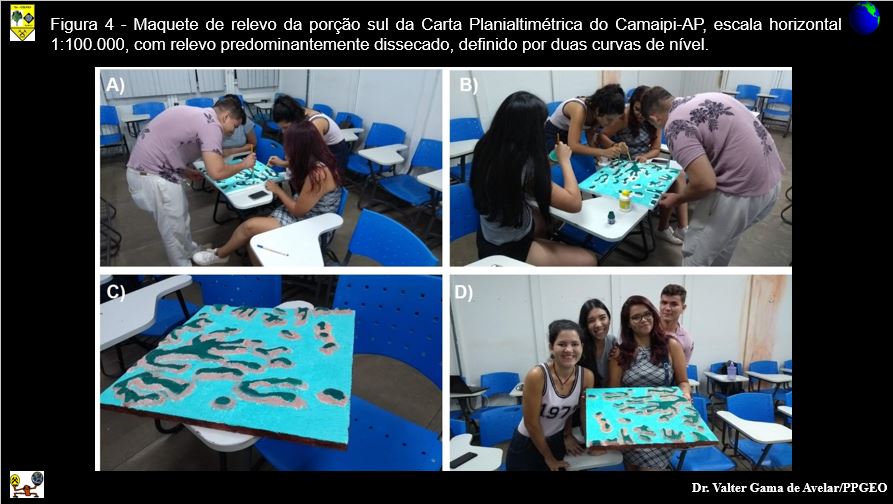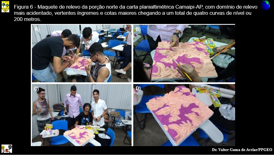 RESUMO: O presente trabalho teve como objetivo principal mostrar aos acadêmicos do Curso de Licenciatura em Geografia da UNIFAP, uma ferramenta facilitadora do ensino, diante das dificuldades enfrentadas em disciplinas que exigem raciocínio lógico e interpretação espacial, como o caso de Cartografia Básica e Geomorfologia. Foi utilizado o método teórico-prático de ensino onde o potencial absorvido foi colocado a prova e testado a todo instante. Por conta disto foram utilizadas técnicas de confecções de maquetes tridimensionais de relevo em isopor. Mostrou-se que é possível desenvolver o estudo do relevo através de práticas e métodos que facilitem o processo Ensino-Aprendizagem, tornando e potencializando o saber geográfico. Como resultado o aluno aprendeu a interpretar cartas planialtimétricos e ainda adquiriu conhecimentos sobre o relevo do estado do Amapá, pois a prática de forma lúdica com as curvas de níveis permitiu aos mesmos a compreensão e interpretação espacial do relevo. A discussão em grupo sobre as características diferentes das 03 (três) maquetes geradas, por conseguinte, ressaltando diferenças nos relevos observados das folhas Camaipi e Cupixi foi o ponto alto do experimento mostrando a eficácia deste tipo de abordagem metodológica no ensino de Geografia.