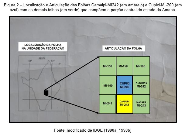 As informações das curvas de níveis para confecção das maquetes tridimensionais de relevo aqui apresentadas foram obtidas a partir de duas cartas planialtimétricas que esboçam as características físicas/relevo da porção central do estado Amapá aqui representadas pelas Folhas Camaipi-MI-242 (sul) e Cupixi-MI-200 (norte), respectivamente, articuladas a leste com as folhas Macapá (MI-241) e Ferreira Gomes (MI-201) e a oeste, com as folhas MI-241 e MI-199, respectivamente (Figura 2).