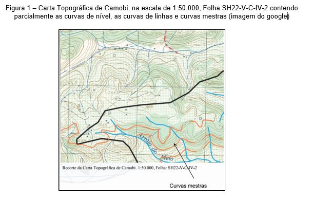 Define-se Curva de Nível uma linha marcada em planta ou mapa topográfico/planialtimétrico e que representa os pontos de mesma altitude do terreno. As curvas de nível constituem a forma mais utilizada para representação do relevo nas cartas, mapas e plantas topográficas (IBGE, 2019). Uma parte da Carta Topográfica de Camobi, na escala de 1:50.000, da Folha SH.22-V-C-IV-2, pode ser vista (Figura 1), permitindo a leitura das linhas que constituem as curvas mestras. Estas curvas são aquelas linhas mais grossas e numeradas com o valor da altitude que ocorrem a cada 5 curvas. A quinta curva é sempre uma curva mestra nas cartas e mapas topográficos.
