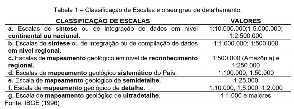 A Escala Gráfica é a representação gráfica da escala numérica sob a forma de uma linha graduada, na qual a relação entre as distâncias reais e as representadas nos mapas, cartas ou outros documentos cartográficos é dada por um segmento de reta em que uma unidade medida na reta corresponde a uma determinada medida real. Enquanto a Escala Numérica é a escala de um documento cartográfico (Mapa, Carta ou Planta) expressa por uma fração ou proporção, a qual correlaciona a unidade de distância do documento à distância medida na mesma unidade no terreno (Ex: 1:100.000 – Lê-se 1 por 100.000). A Tabela 1 ilustra a classificação das escalas de acordo com o grau de detalhamento destas.