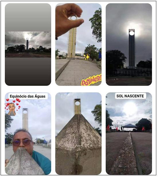 A Figura 2 ilustra diferentes aspectos do Monumento Marco Zero do Equador/MMZE, com destaque para a posição do sol, em sua trajetória aparente, perpendicular a linha do equador.