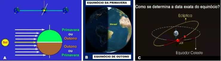 Figura 1 – Em A) incidência dos raios solares, na Terra em dia de equinócio. Em B) Imagem da Terra vista do espaço em dia de Equinócio. Em C) Definição do ponto exato do dia do equinócio, quando a eclíptica coincide com o equador celeste.